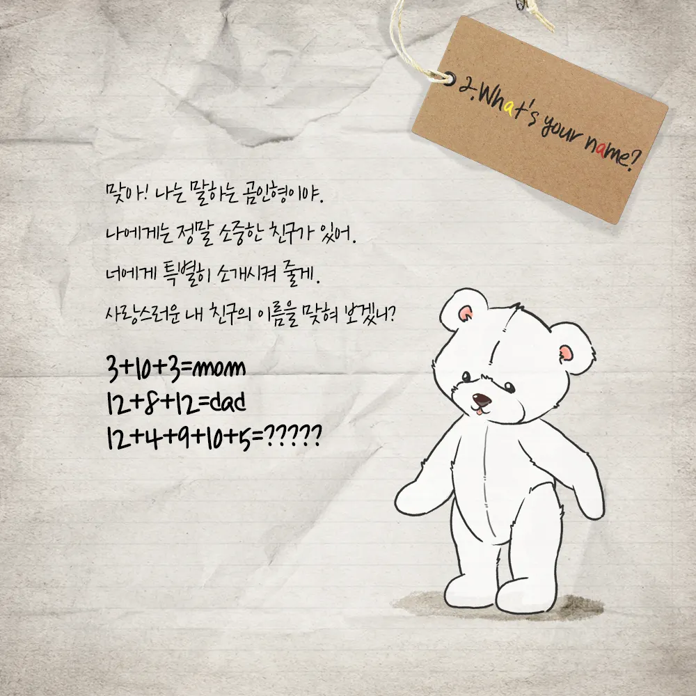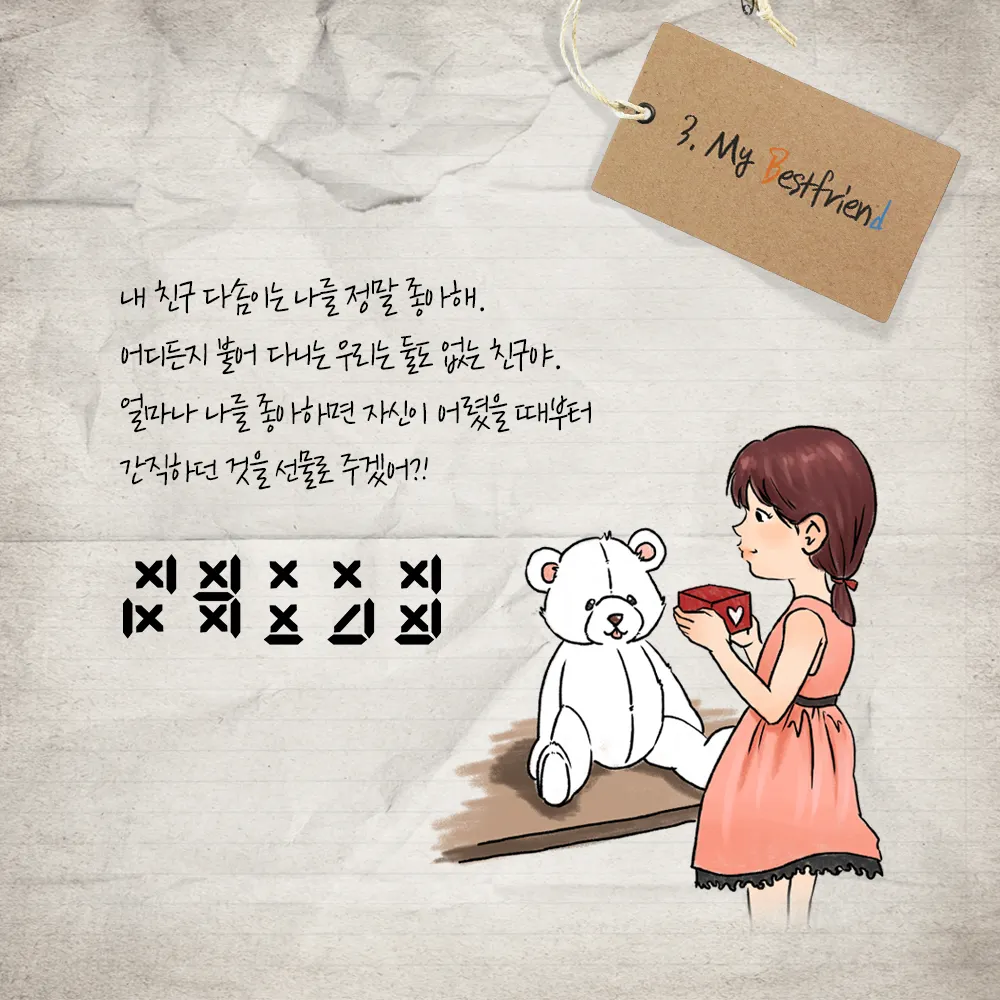 카카오톡 방탈출 제작자 Yena 님과 플레이더월드가 함께 제작한 'Dear. My Friend'는 버려진 곰인형의 이야기를 다룬 테마입니다. 플레이더월드로 서비스명을 바꾸기 전인 2018년 10월 12일에 코드네임에서 공개된 첫 번째 온라인 테마로 카카오톡 플랫폼의 한계로 인해 주관식 정답 입력의 틀을 벗어나기 힘든 기존의 온라인 방탈출에 다양한 입력 형식을 더했습니다.
