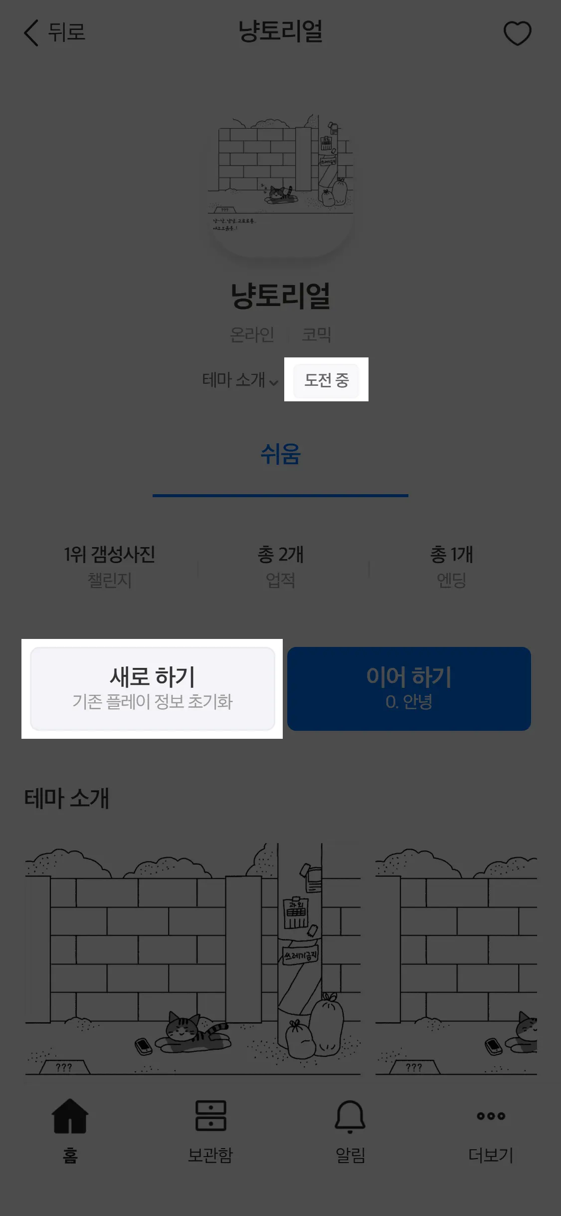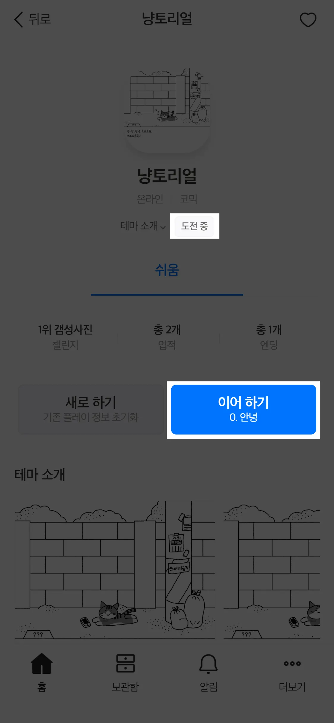 다시 테마 상세 페이지로 들어가면 중단했던 스테이지부터 다시 시작할 수 있는 이어하기 버튼과 기존 플레이 기록을 초기화하는 새로 하기 버튼이 활성화되어 있는 것을 확인할 수 있습니다.