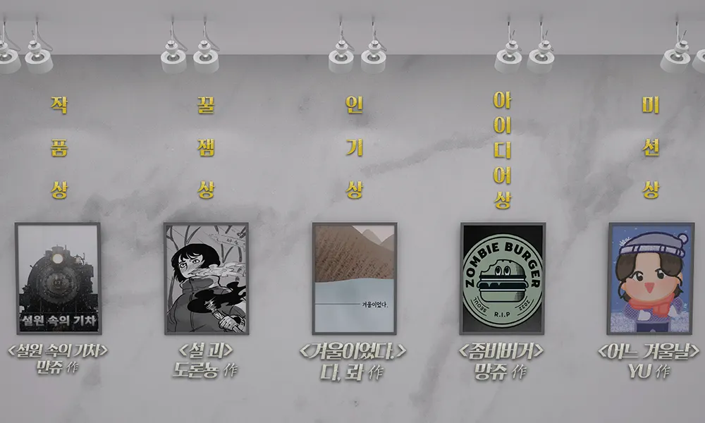 작품상에 <설원 속의 기차>, 꿀잼상에 <설괴>, 인기상에 <겨울이었다.>, 아이디어상에 <좀비버거>, 미션상에 <어느 겨울날> 입니다. 축하드립니다!